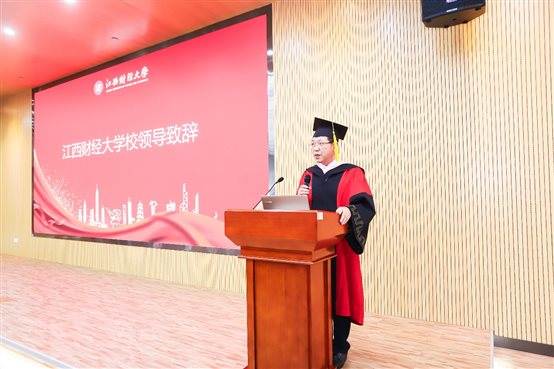 副校长袁红林为全体毕业生致辞,对全体毕业生顺利完成学业,即将踏上崭新征途表示衷心的祝贺,同时希望各位同学坚守学校校训——信敏廉毅,保持一个优秀的江财人的身份继续前行,奋力拼搏、积极向上,创造属于自己的辉煌人生!