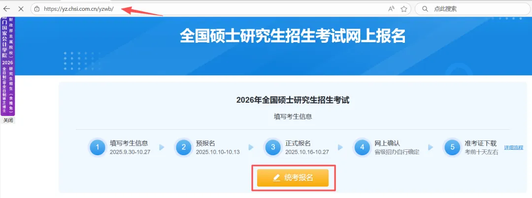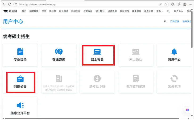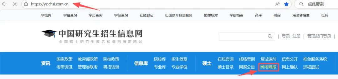 1.点击进入研招网:中国研究生招生信息网 (chsi.com.cn),点击统考网报,然后点击统考报名。