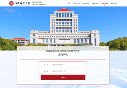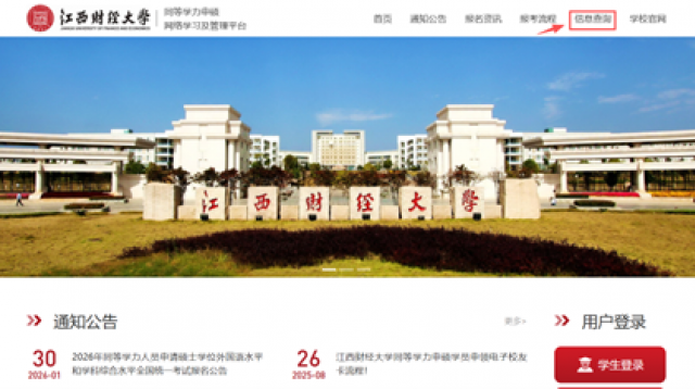 登录江财同等学力平台网站:https://onlinestudy.campuswit.com/jxufe 点击右上角【信息查询】-【学生信息查询】进入查询界面。